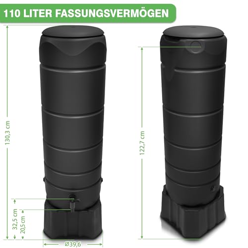- 110 LITER FASSUNGSVERMÖGEN - Wassertonne im mit unglaublichen 110 Liter Fassungsvermögen. Wasserfass ist für die Größe relativ schmal gehalten und spart somit Platz aber sieht modern aus. Breite und Tiefe Standfuss: 39,6cm, Höhe Regentonne 130,3 cm (inkl. Standfuß)