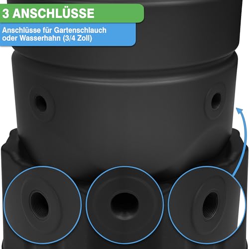 - ANSCHLÜSSSE - Regensammler besitzt 3 Anschlüsse für Wasserhähne/Wasserschläuche 3/4 Zoll. Regentonnen werden mit einem Wasserhahn ausgeliefert. Auf der Rückseite befindet sich eine vordefinierte Stelle an der das Fallrohr angeschlossen werden kann.