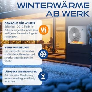 - 𝗛𝗲𝗶𝘇𝗲𝗻, 𝘄𝗲𝗻𝗻 𝗮𝗻𝗱𝗲𝗿𝗲 𝗮𝘂𝗳𝗴𝗲𝗯𝗲𝗻! – Die Außeneinheit mit integrierter Heizfunktion sorgt selbst bei eisigen Temperaturen für zuverlässige Wärme und höchsten Komfort in Ihrem Zuhause – effizient, leistungsstark und jederzeit einsatzbereit.